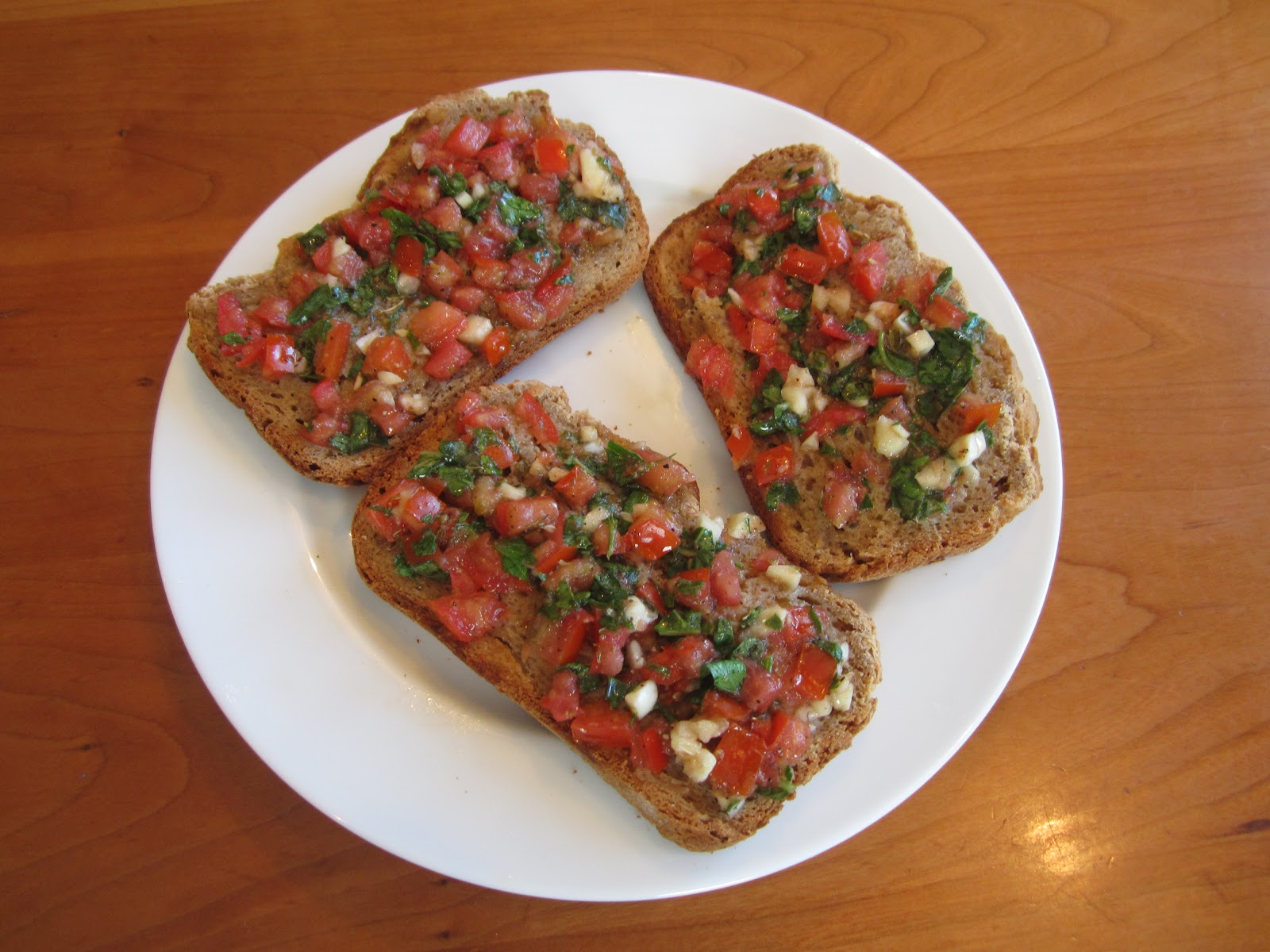 If you are not gluten free, preheat oven to 400 degrees. Place sliced French or Italian type bread on a baking sheet and spread tomato mixture on top, then sprinkle with parmesan cheese. Bake for 8-10 minutes.