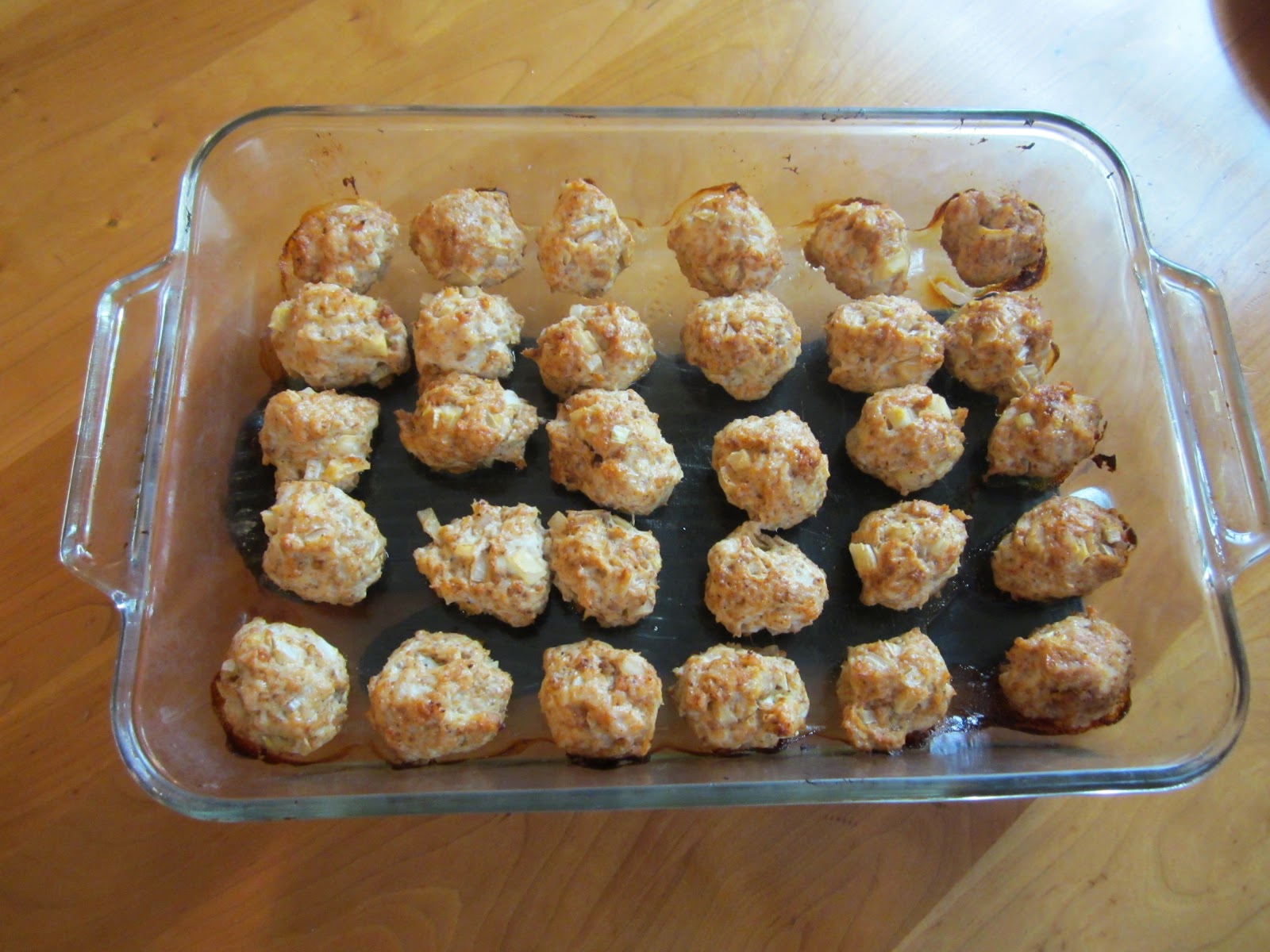 create 1 ½ inch meatballs.  Place on a  9×13 greased baking dish (may need two).  Bake at 400 degrees until moist and golden