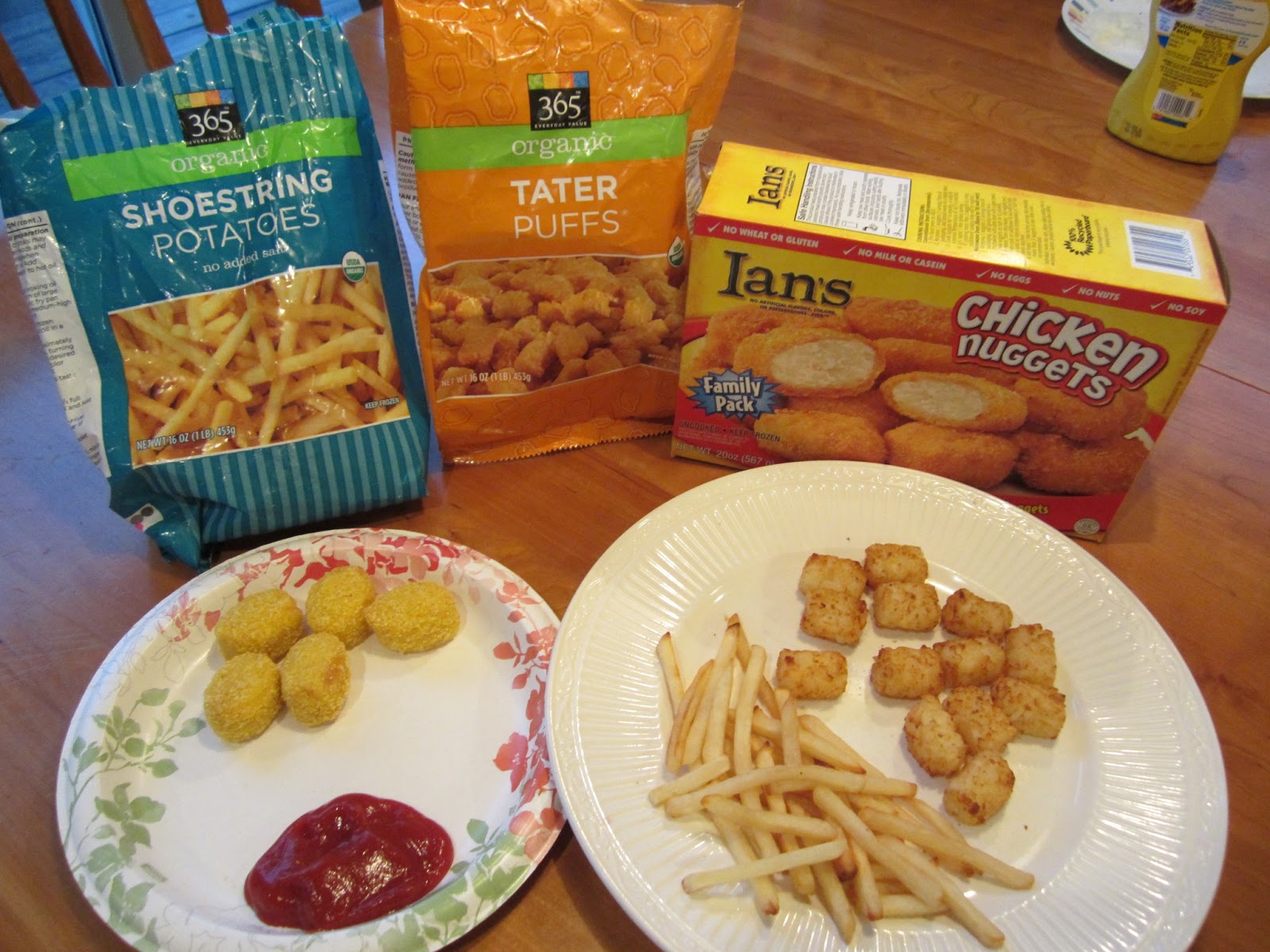 Later I also made 365 tator tots and shoestring fries and my two youngest had strawberries. I try not to give meat and potatoes at the same time as it halts all digestion. I usually make them at least an hour later.Then I made Ian’s GFCF chicken nuggets. My 2-year old didn’t eat her hamburger. Sometimes she will and sometimes she won’t.